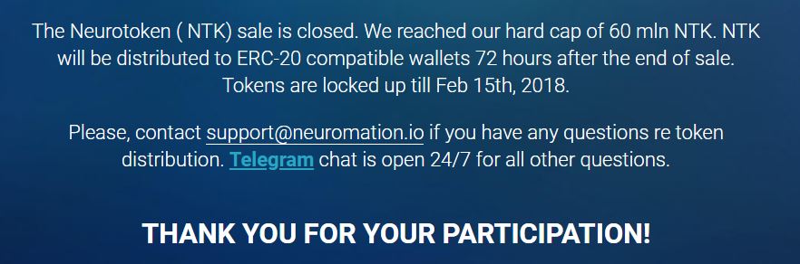 La vente publique ainsi que la période de « pre-sale » ont permis de vendre 60 millions de Neurotokens pour un total de 50 millions de dollars US (0,001 ETH au cours au 7 janvier 2018). Les contributions ont été payées en Etherium, Bitcoin, et autres altcoins majeurs. Les participants inscrits sur la plateforme de vente au cours de cette période proviennent de 89 pays, soulignant ainsi la portée mondiale de l'intérêt pour Neuromation.