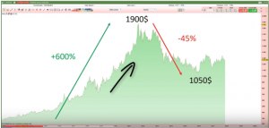 Comme déjà expliqué plus haut, lorsqu’un cours atteint un sommet, il ne peut que descendre après de par le fait que les investisseurs, ayant réalisé les bénéfices souhaités (ou même en les ayant dépassés), finissent par vendre pour les concrétiser. Pour ceux qui sont arrivés un peu trop tard, finissent aussi par vendre pour limiter les pertes. Ce qui fait perdre davantage de valeur à l’or.