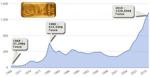 Comme pour n’importe quelle matière, le cours de l’or s’est décidé selon le rapport de l’offre et de la demande. Il a aussi connu des hauts et des bas, mais le cours le plus haut jamais atteint était en 1980 où il a atteint un sommet jamais réalisé auparavant (850 USD). Peu de temps après, comme on aurait pu s’y attendre, une correction vint baisser son prix considérablement pour atteindre les 300 USD.