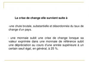 Il arrive souvent qu’une monnaie soit dévaluée à un certain degré. Mais il arrive aussi parfois que la dépréciation excède la moyenne de manière considérable. Dans certains cas, elle dépasse les 25 % en comparaison avec l’USD. C’est ce qu’on appelle la « crise de change » et ça se produit en général lorsque l’économie du pays concerné est en mauvaise passe. Il est possible de les prévoir quand il y a une forte inflation ou lorsque le pays est fortement endetté. Ces symptômes ne motivent pas les investisseurs et les encourage même à prendre leur distance. On comprend alors que si on arrive à prévoir ce genre de situations, il est possible de vendre à temps et d’éviter de se retrouver avec une part d’investissements placée sur une devise dévalorisée. C’est ce qui cause la crise qu’on nomme « auto réalisatrice » et qui se traduit par la diminution de l’offre et la croissance de l’offre.