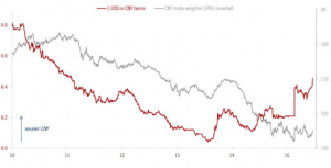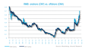 - Le Yuan Offshore (CNH) : Il s’agit de la monnaie qu’on utilise pour toutes transactions offshore mais n’est pas soumis aux mêmes réglementations. C’est pour cette raison que malgré le fait qu’il devrait normalement avoir une tendance similaire au Yuan Onshore, on constate qu’en réalité, un écart se creuse continuellement entre les valeurs des deux monnaies. Malgré les promesses du gouvernement chinois de réévaluer le Yuan, les experts pensent qu’au contraire, il va continuer à dévaluer sa monnaie. Avec des nouvelles contradictoires comme celles-ci, il est difficile de savoir pour sûr, si la valeur de la monnaie nationale chinoise va monter ou descendre. On ne manquera pas de noter qu’avec l’écart qui se crée entre le CNY et le CNH par rapport au dollar américain, la volatilité de la monnaie n’en devient que plus prononcée.