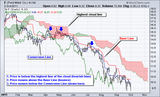 - Le signal baissier moyen comporte une Courbe Chikou en-dessous du niveau des prix, un niveau des prix en-dessous du Nuage, et un croisement des courbes Tenkan et Kijun dans le Nuage. Il est assez risqué de se lancer à ce moment-là, car la tendance à venir est encore non confirmée.